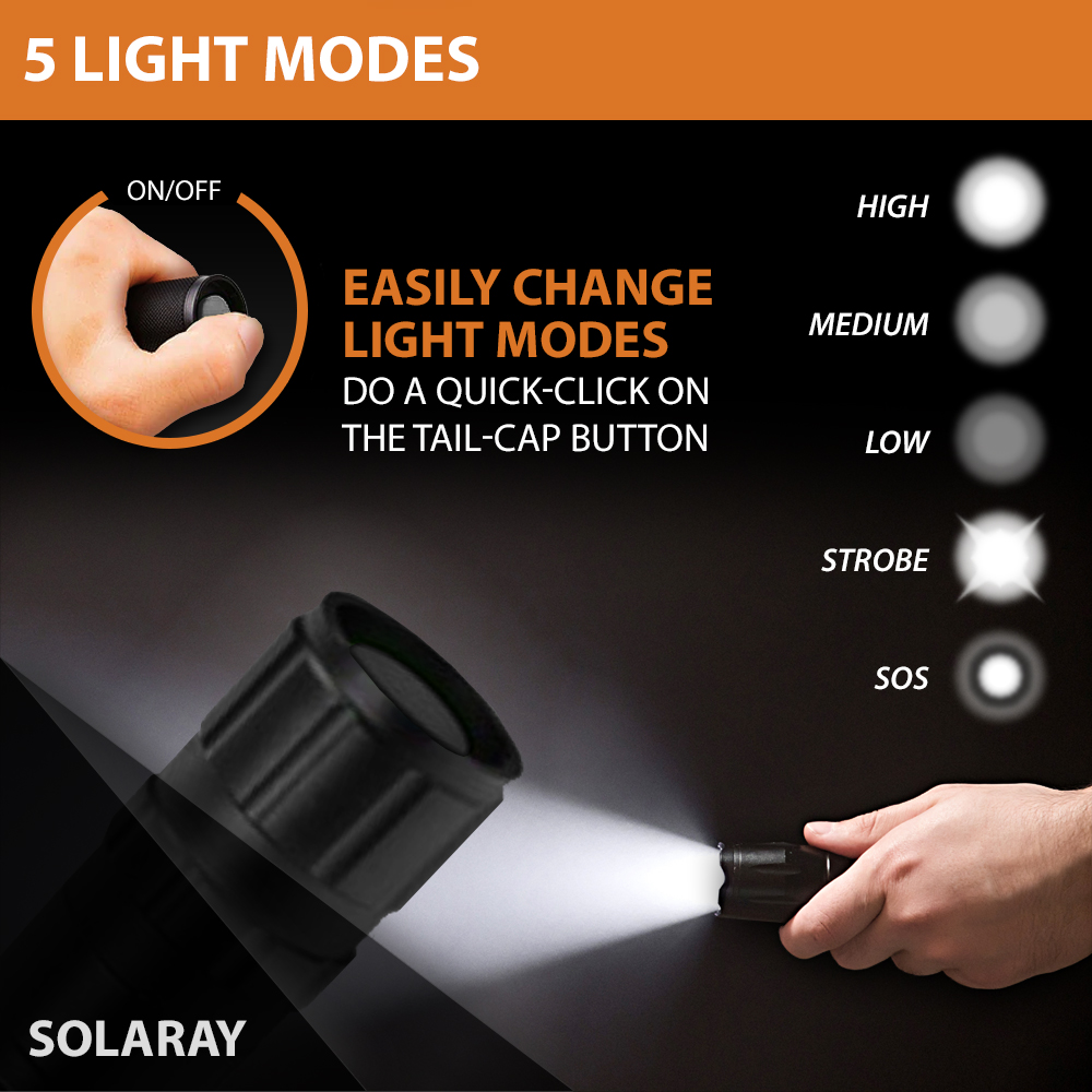 • 5 Light Modes: High, Medium, Low, Strobe and SOS
